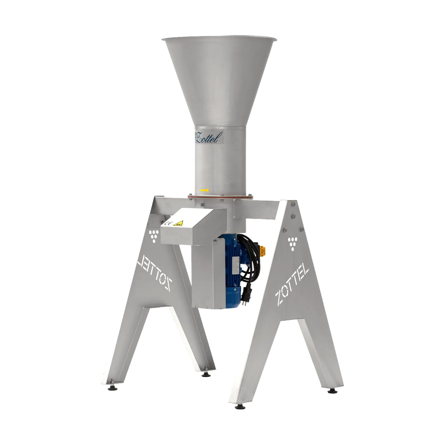 Zottel fruktknuser er en høykvalitetsmaskin som er utviklet for å knuse epler, pærer, plommer og annen frukt og grønnsaker. Steinfrukter må kjernes ut før knusing. Sentrifugalknuseren er utelukkende laget av rustfritt stål AISI304 og er sertifisert som næringsmiddelsikker. Perfekt for det lille mosteriet og kan kombineres med en av de større hydropressene.